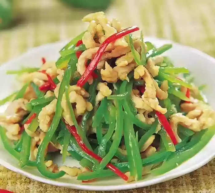 Ingredients: 100g of green pointed peppers, 150g of shredded pork, and 50g of red bell pepper strips are all you need.