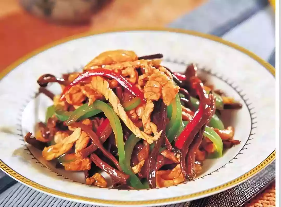 - Heat a wok, add some oil, and cook the marinated pork until it turns color. Take out and let drain. In the same wok, cook the spring onions and minced ginger until they smell good. Then, add the pointed pepper strips and stir well. Add the pork shreds and red bell pepper strips and cook until almost done. Lastly, mix in the sauce you made ahead of time and serve.