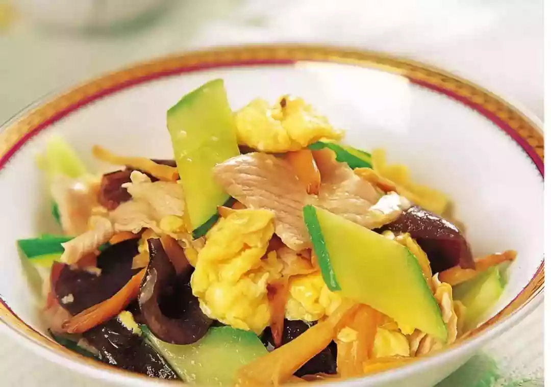 Ingredients: 150g of lean pork, 3 eggs, 50g of soaked daylily buds, 50g of wood ear mushrooms, and 50g of cucumber slices are all you need.