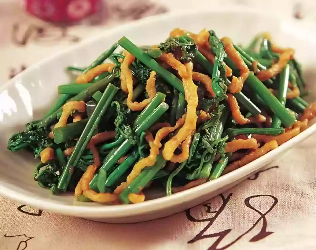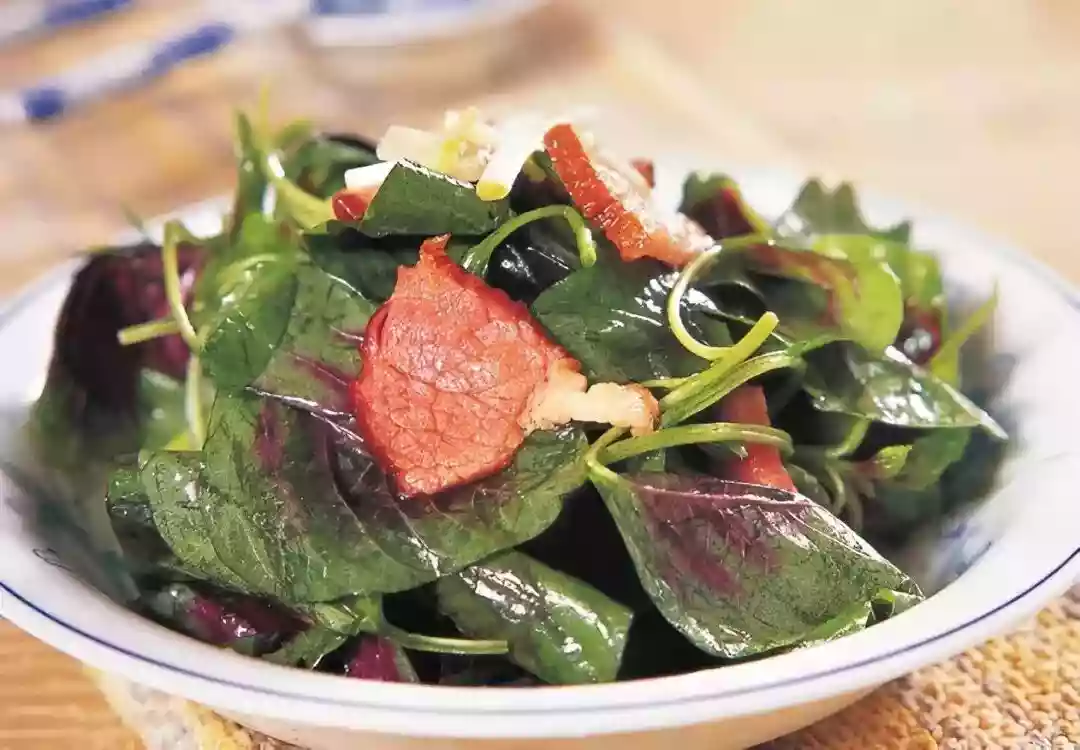 - Put some oil in your wok and heat it up until it shimmers. Add the sliced cured meat and fry it until it starts to ooze its rich fat. Add the ginger strips and green onion pieces, and stir-fry them for a short time. Then, add the amaranth right away. Add some salt and MSG, and quickly stir-fry everything together. It's all about keeping the flavors locked in and the action fast.