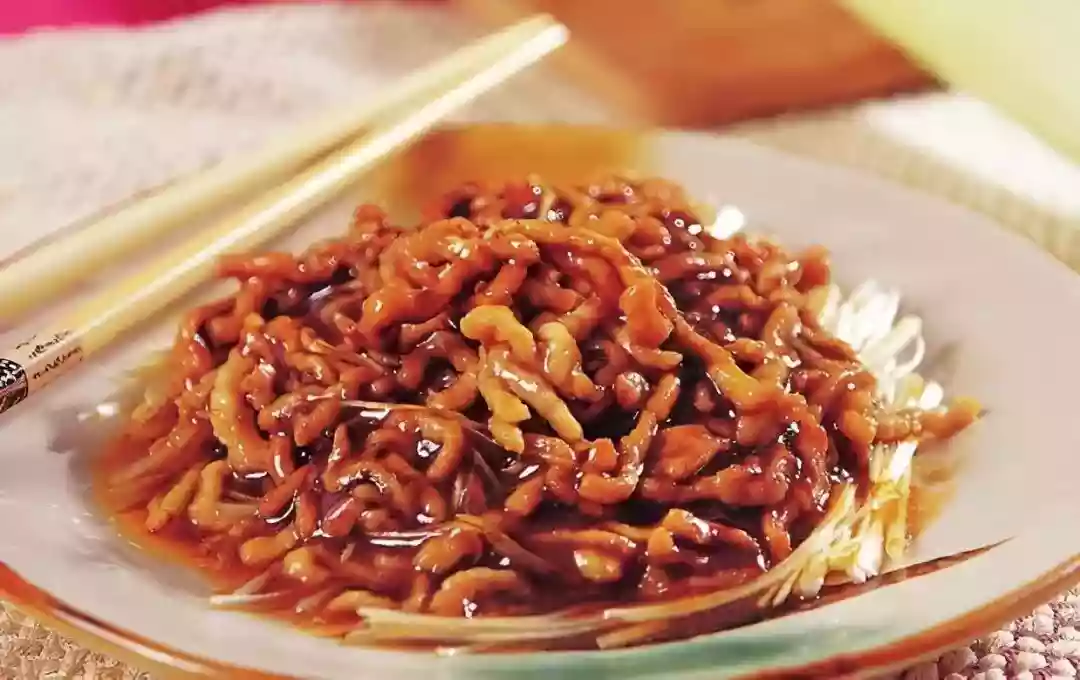 - Add more oil to the pan and mix in the yellow bean paste and sugar until the mixture is sticky and smells good. Put the pork strips back in and add the MSG, ginger juice, and cooking wine. Quickly stir-fry everything, making sure the sauce coats the pork strips evenly. Add a little bright oil on top and serve the pork wrapped in a soft bean curd sheet for a traditional touch.