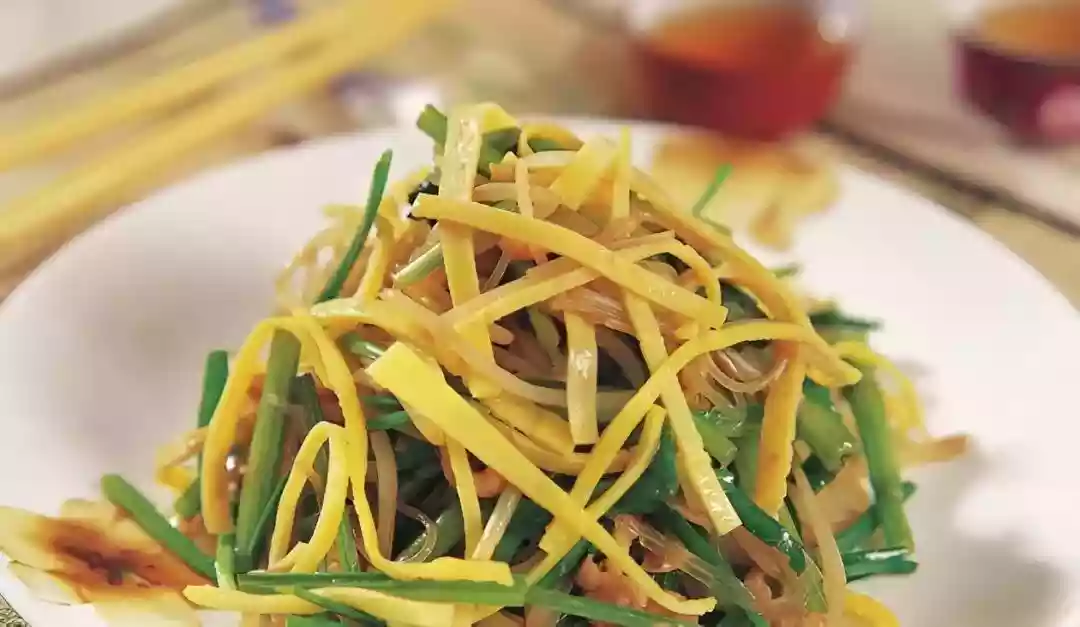 - Add the pork strips to a hot skillet with a little oil and stir until they start to soften. Add the scallion shreds, and when the pork is tender, add the bean sprouts and let them cook until they are just soft. Next, add the spinach and leek pieces, the soaked vermicelli noodles, and finally, the strips of egg skin. While you stir-fry, add soy sauce, cooking wine, ginger juice, salt, MSG, and a little sesame oil to the mix. Keep stirring everything in the pan until the flavors blend well and the vegetables are soft but still bright. Serve hot, and every bite will be a symphony of textures and flavors.