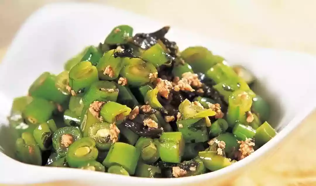 Ingredients: 350g of green beans, 75g of minced pork, and 10g of olive vegetables are all you need.