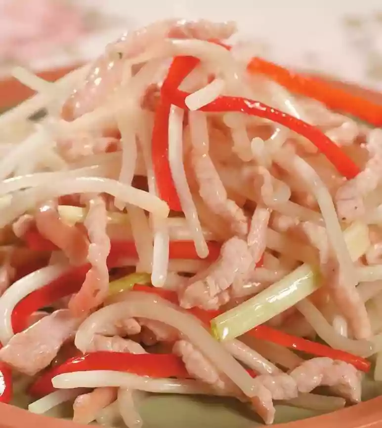 - Add a little oil to the pan, turn up the heat, and quickly stir-fry the red pepper strips and mung bean sprouts with the spring onion segments. Put the pork strips back in, add salt and MSG, and thicken the sauce with water starch. At the end, a splash of hot oil brings it all together.