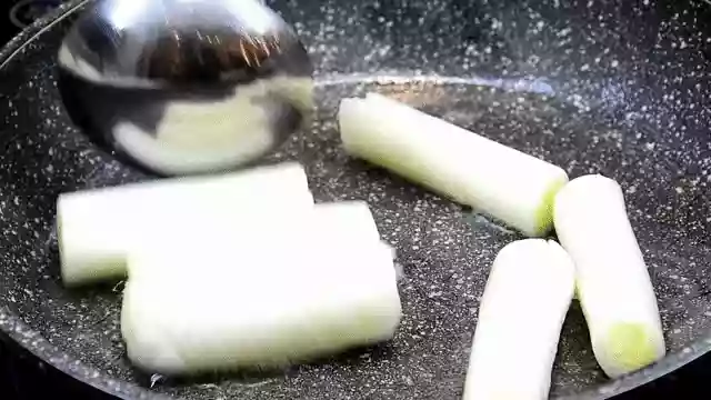 Simply frying chopped scallions in oil doesn't give this dish its scallion flavor. You need to make scallion oil first by cooking chopped scallions in a pan. This scallion oil is then used as the base oil for frying the sea cucumber, which makes sure that the final dish has a strong scallion flavor. A good tip is to use the white parts of the green onions, cut them up, and fry them with the cleaned green onion roots.