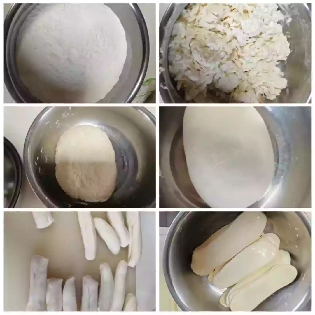 - First, let's get the dough ready. Put some flour and salt in a bowl and mix them with cold water, depending on how many servings you want. Slowly add water while stirring until the mixture becomes crumbly. Then, knead it into a ball. If you don't know how to knead well, choose a dough that is a little softer so it is easier to work with. At first, it won't be smooth. Give it some time to rest before kneading it again. After the dough has rested, roll it out and cut it into strips. Then, shape the strips like the picture shows. Don't forget to brush them with oil and let them sit for a while.