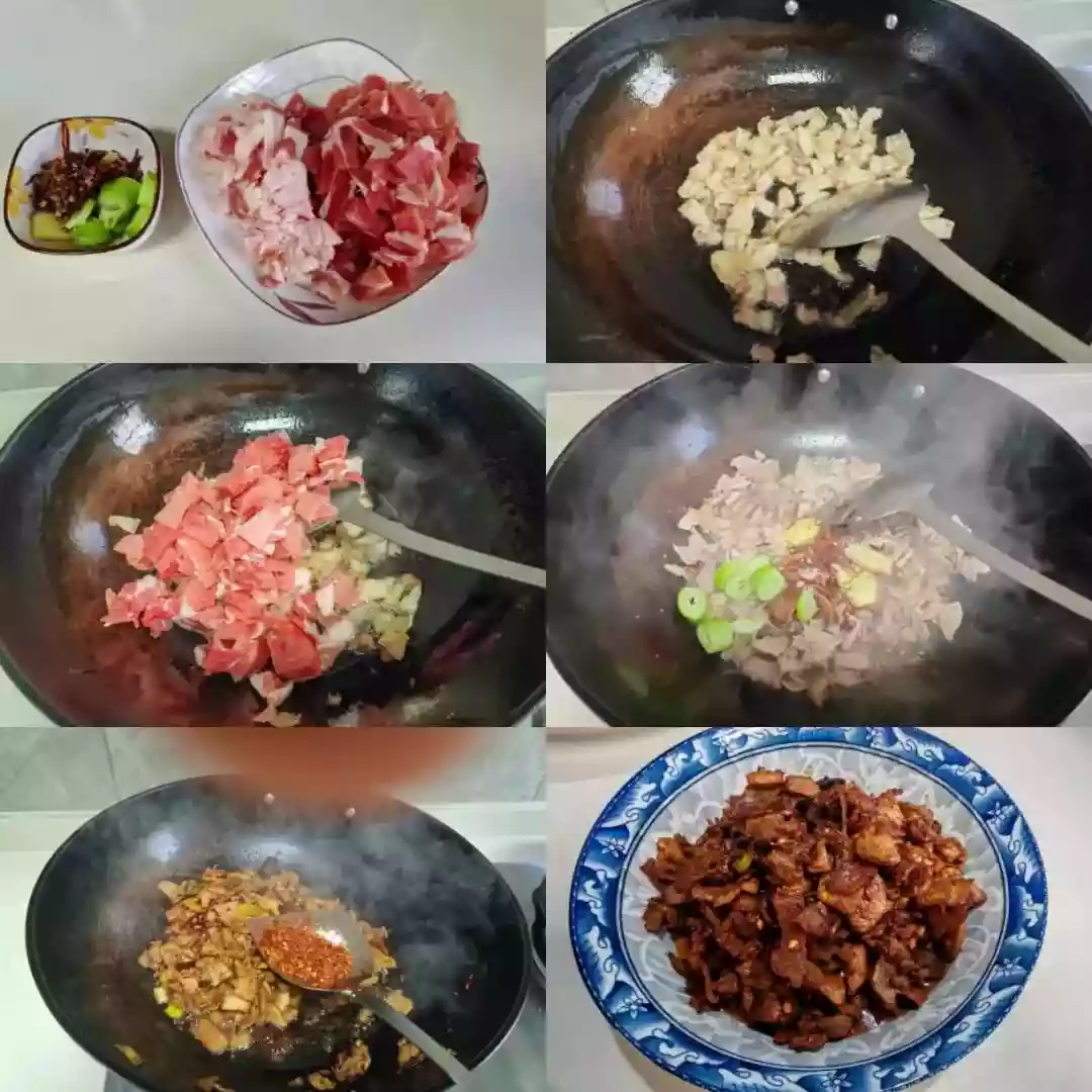 The next step is to make the meat sauce without adding water. Cut the pork shoulder into pieces that are both fatty and lean. Put cold oil in a hot pan, then add the fatty meat and cook it over low heat until the fat melts. Next, add the lean meat and stir until it looks shiny. To bring out their smell, add ginger, scallions, star anise, a cinnamon stick, fennel seeds, and Sichuan peppercorns. Add the light and dark soy sauces and stir until the sauce is well colored. Then add the black vinegar and chili powder. Stir-fry for another five to six minutes, then add salt to taste.
