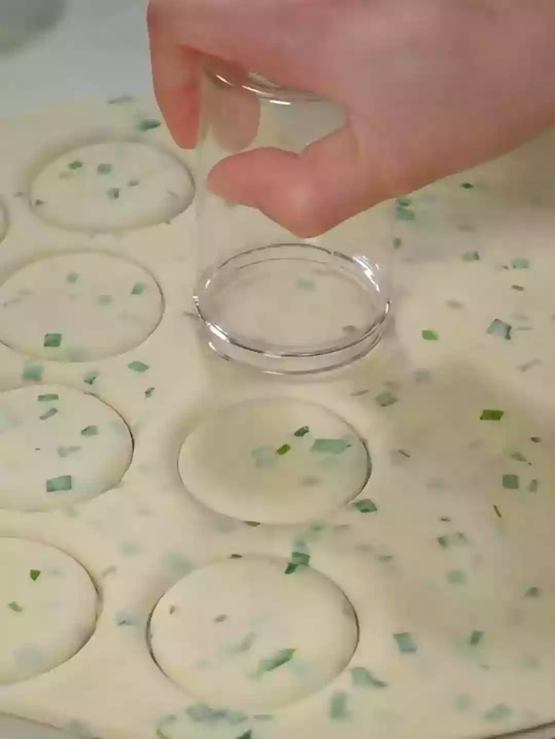 Add a handful of chopped scallions and knead the dough until it is smooth. Make a big, thin sheet by rolling it out. Press out round shapes with a mold or a cup. You can use the leftover dough again, so don't throw it away!