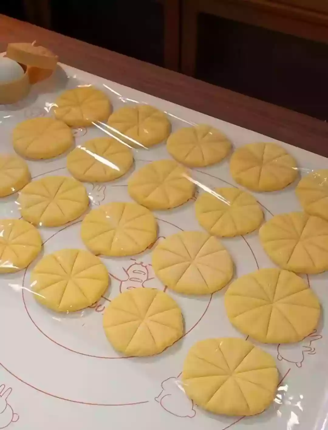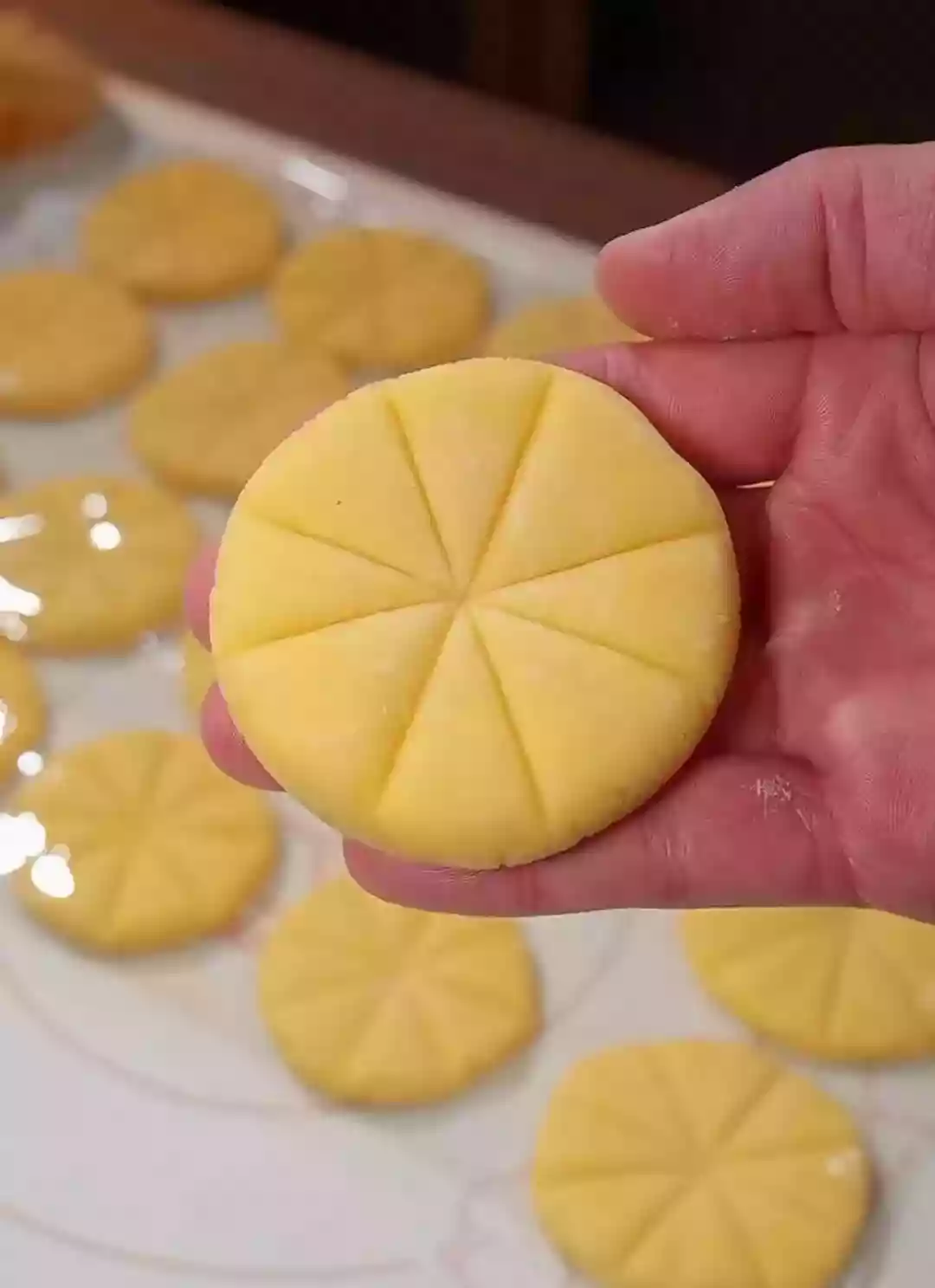 Use a knife to shape each piece into a small cake. Use the same knife to make an X shape on top of each cake. They should look like this.