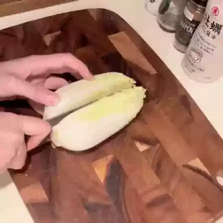 1. Cut the baby napa cabbage in half lengthwise, then cut it into several pieces.