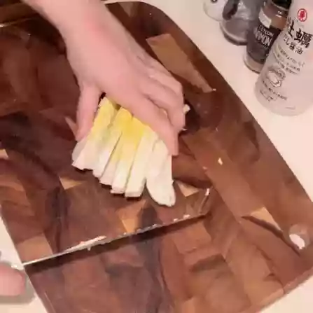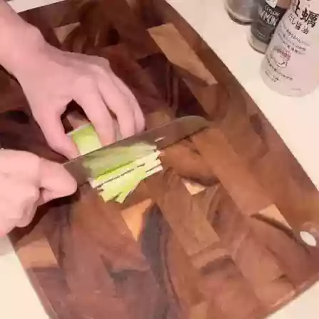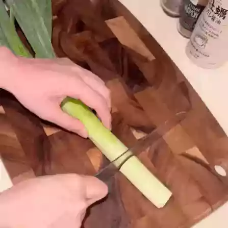 - Cut the green onions into pieces, and then cut them open from the side.