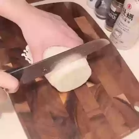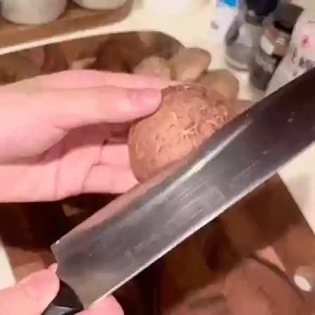 People often ask me about cross-cutting shiitake mushrooms. Well, it's really easy: cut diagonally toward the center from both sides twice, then scoop out the cut part and you're done.